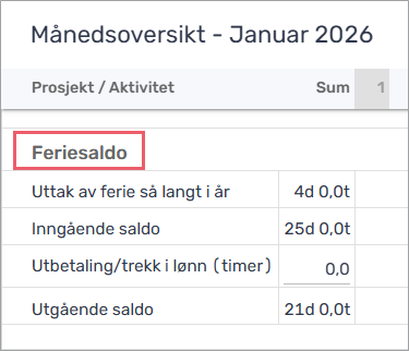 Feriesaldo er antall dager med ferie som en ansatt kan ta ut. Som oftest er dette ferie med lønn. Dager utenom feriesaldo må registreres som aktiviteten «Ferie u/ lønn».