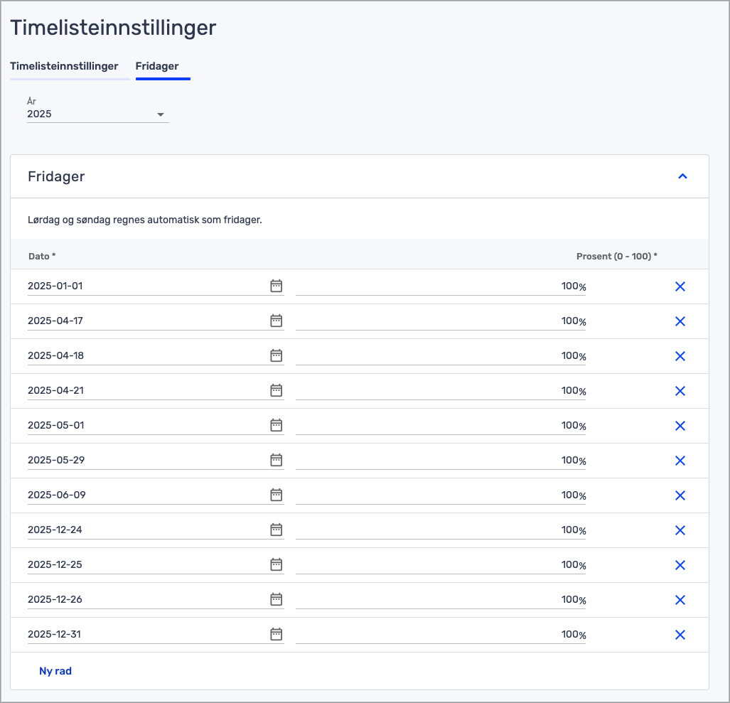- Velg «Ny rad» og legg inn dato og om fridagen skal gjelde hele eller deler av en vanlig arbeidsdag.
