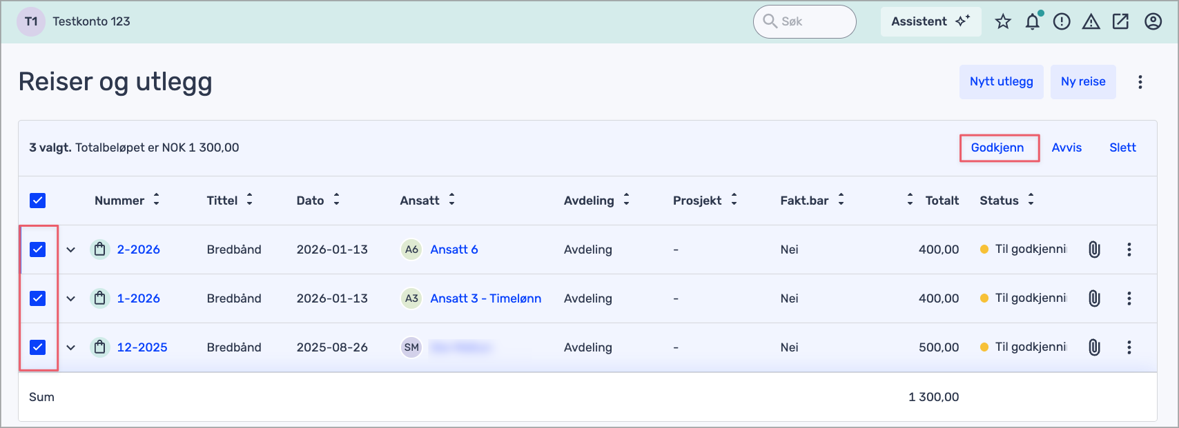 Alle reiseregning/utlegg som du har valgt endrer status og legger seg som «Godkjente».