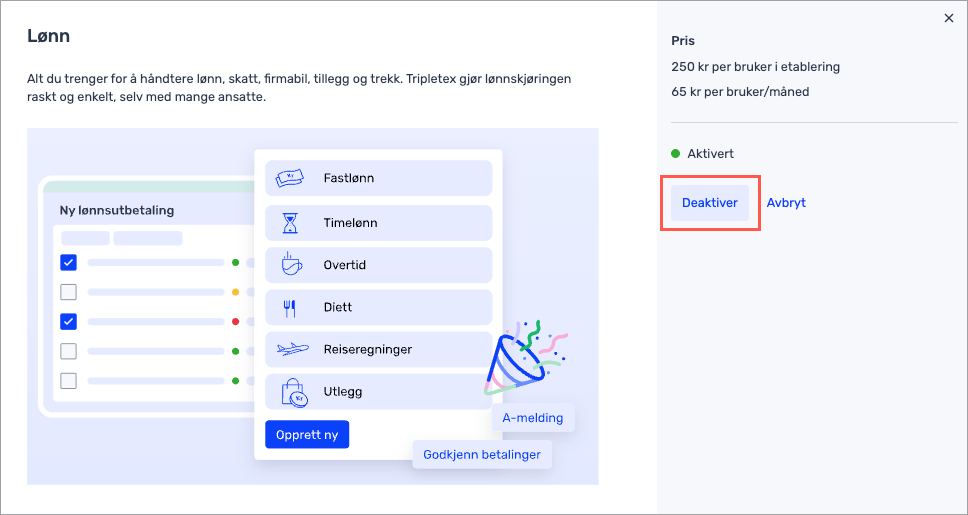 - Klikk på «Deaktiver» for å deaktivere modulen/tilleggstjenesten.