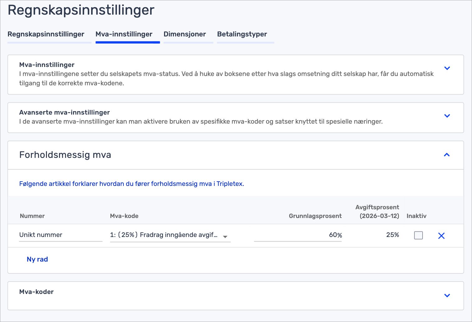 - Legg til ny rad for å opprette ny mva-kode for forholdsmessig mva.