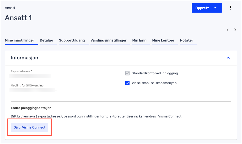 - Se på seksjonen «Informasjon» under «Mine innstillinger» og klikk på «Gå til Visma Connect».