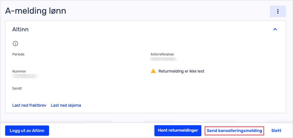 - Send A07 til vår support på e-post, support@tripletex.no, så hjelper vi deg med å hente inn returmeldingen på kanselleringsmeldingen manuelt.
