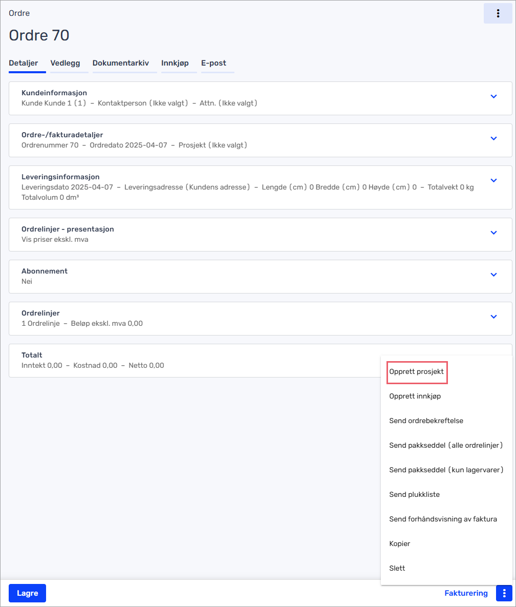 Du kan ikke overføre en utgående faktura (ordre) som er allerede fakturert over til et prosjekt, men du kan opprette et prosjekt ut ifra en fakturakladd (ordre).