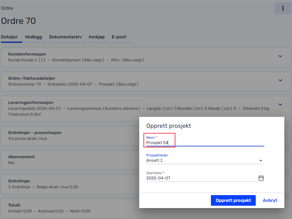 - Fyll inn navnet på prosjektet, velg hvem som er prosjektleder, og evt. startdato for prosjektet. Klikk på «Opprett prosjekt» for å fullføre handlingen.