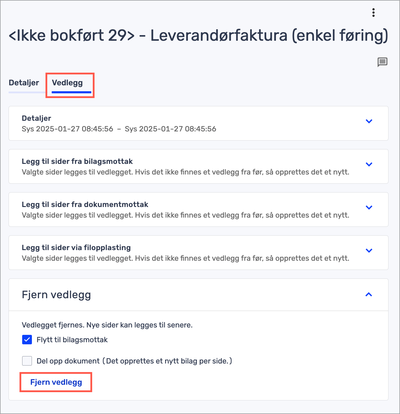 Fjerne vedlegg på avansert bilag eller en leverandørfaktura