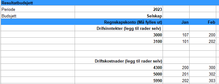 - Følg oppsettet i eksempelfilen for å unngå feil. Tips: Ikke fyll inn selskapsnavnet ditt i feltet «Selskap» – der skal det stå hvilken type budsjett det gjelder.
