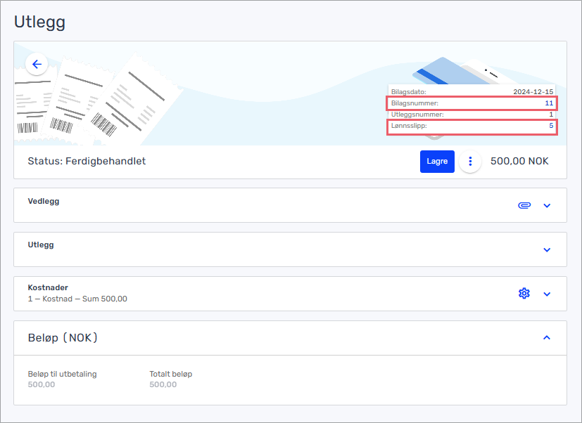 Reiseregninger og utlegg låses for endring når de blir tilknyttet et bilag eller kjøres på lønn. Hvis utlegget er bokført, må du først fjerne tilknytningen det har til et bilag eller lønnskjøring.