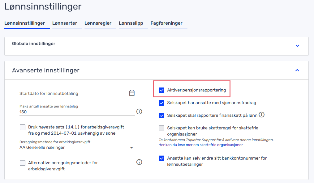 Når du aktiverer Tripletex Lønn i Mamut, blir pensjonsinnretningen med over til Tripletex. Du finner den inne på Lønn > Innstillinger > Regnskapsregler.