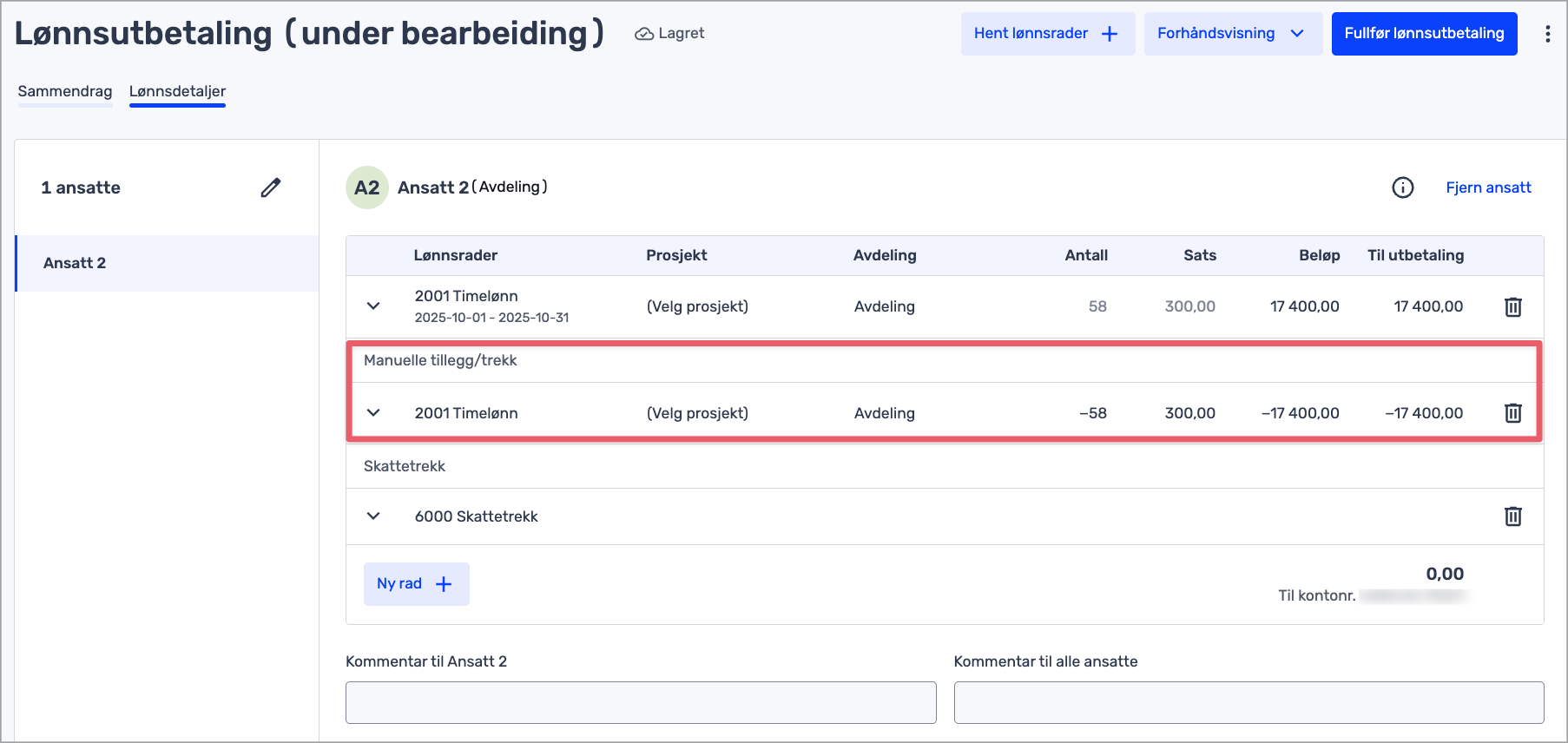 Før en identisk manuell rad på lønnskjøringen som nuller ut timene. Timene lukkes i ansattreskontro og blir ikke med på neste lønnskjøring.