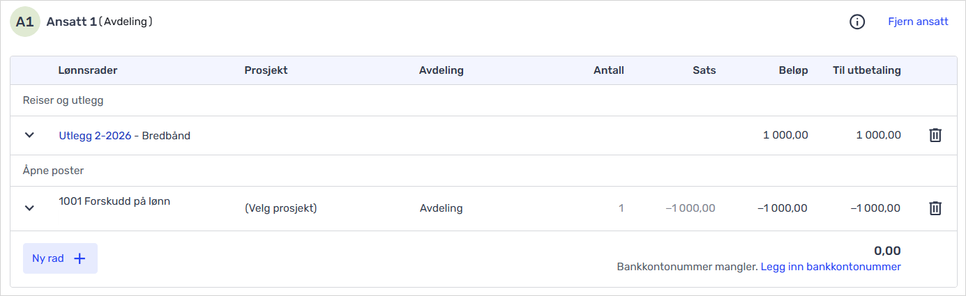 - I neste lønnsutbetaling, utbetal reiseregningen med den negative posten for det tidligere utbetalte forskuddet.
