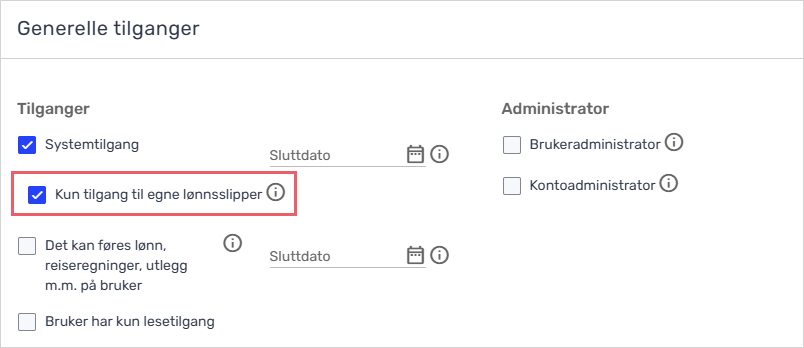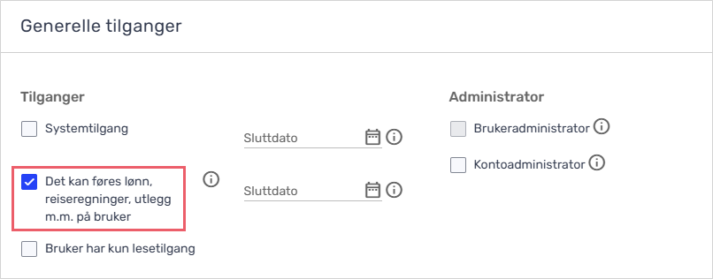 Her ser du en enkel oversikt over de ulike brukerkategoriene og hva de gir tilgang til og hvilke brukertilganger de er tilknyttet. Om du er brukeradministrator i kontoen, finner du priser for de ulike brukerkategoriene ved å gå til Selskap > Brukerlisenser i hovedmenyen. Les mer om priser her.