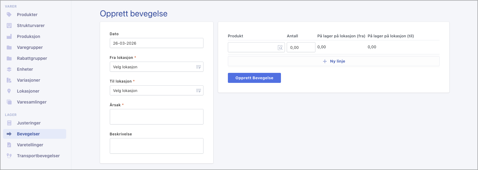 - OBS! Lagerflyttingen lagres som et utkast. Når du klikker på «Bokfør» i oversikten går lageroverføringen gjennom og lagerantallet oppdateres for de valgte lokasjoner.
