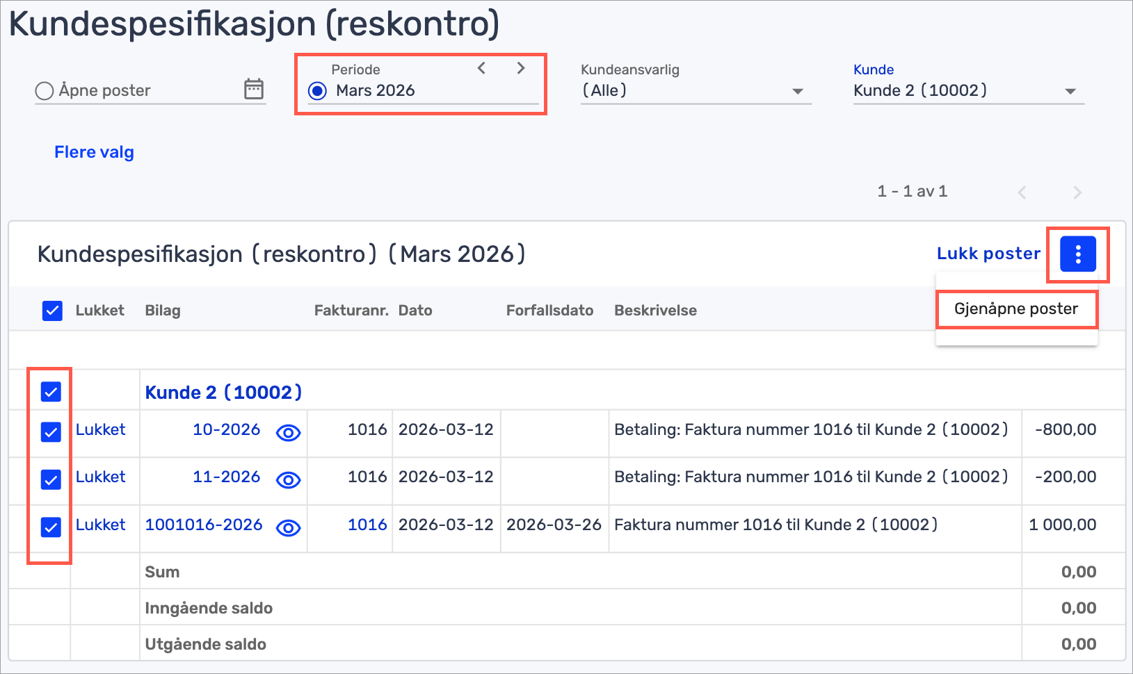 - Gå til «Regnskap > Reskontro» i hovedmenyen og velg reskontroen du ønsker å gjenåpne poster på.
