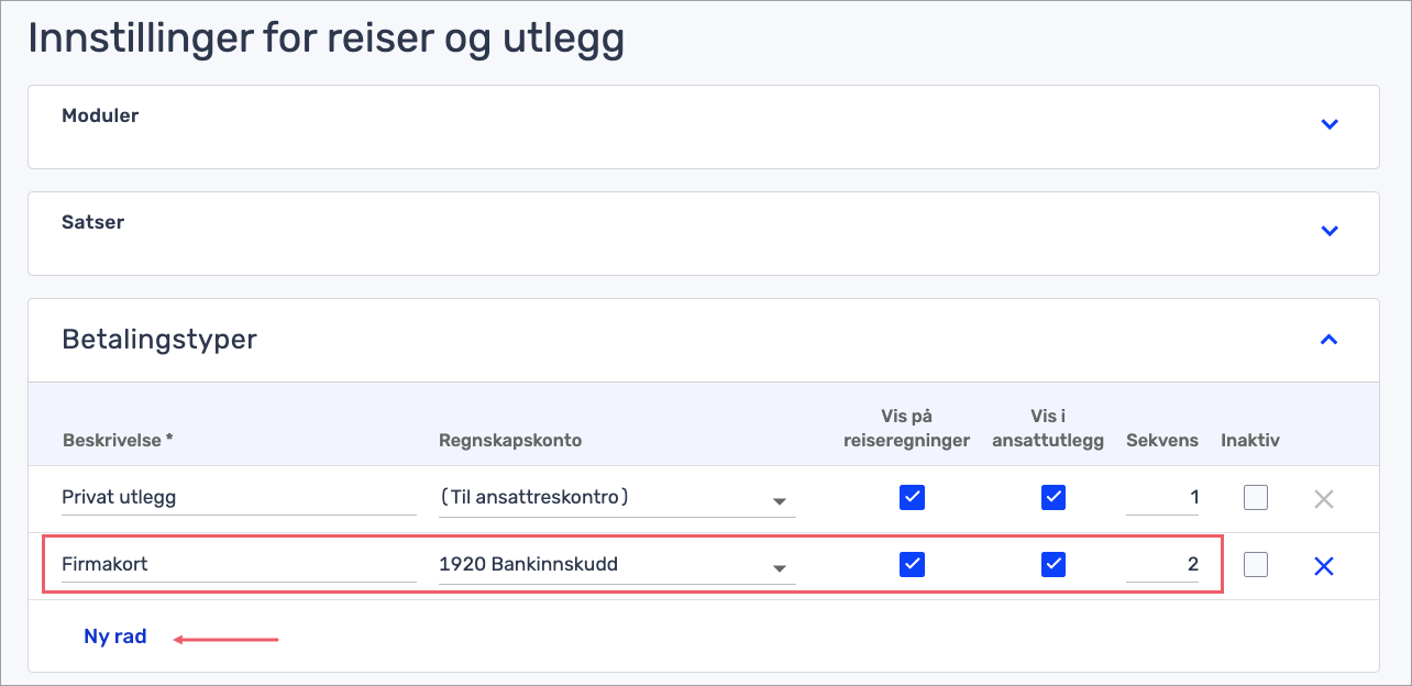 Hvordan oppretter jeg en betalingsform for firmakort på reiseregninger og utlegg?