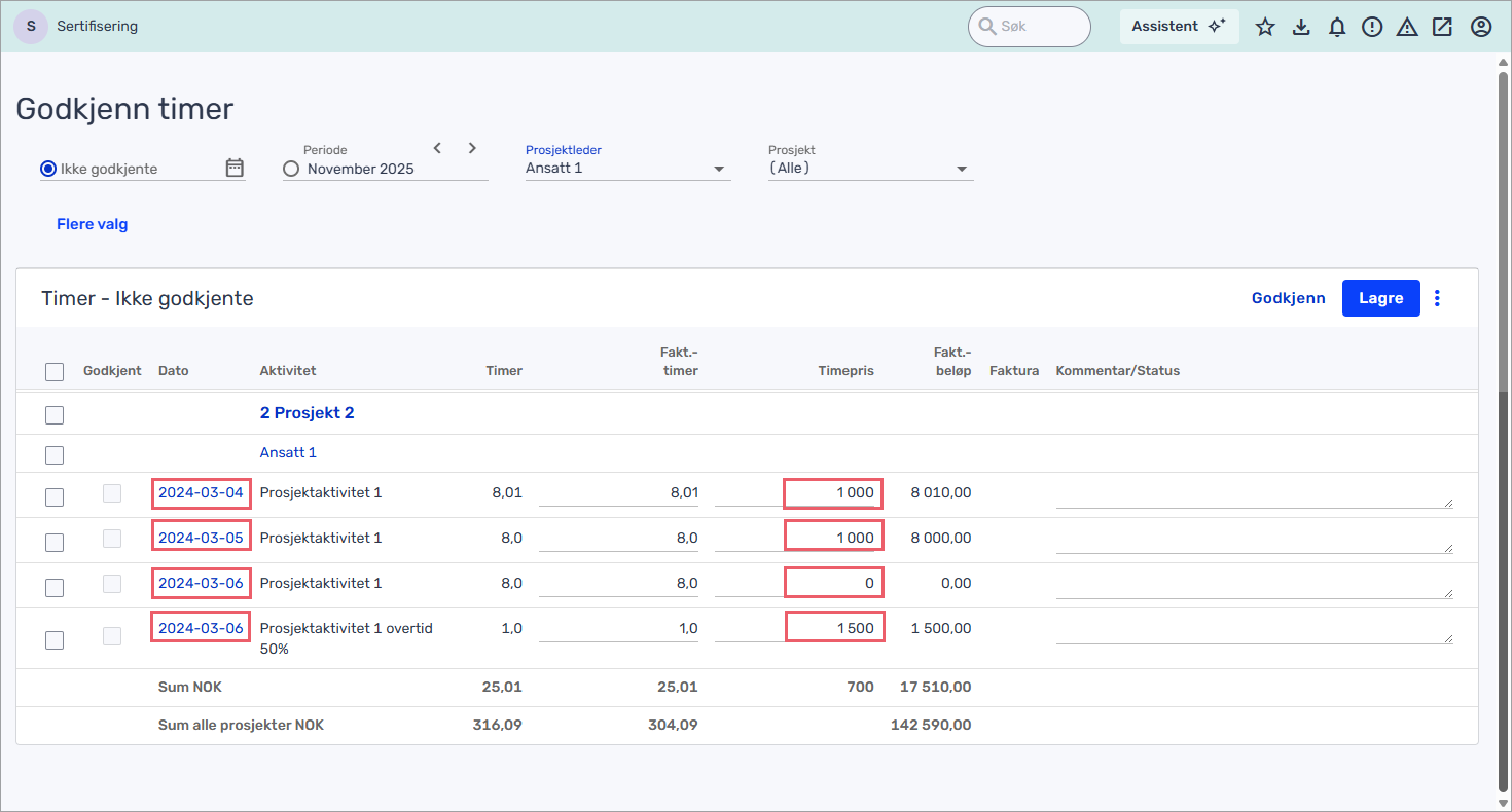 Hvis du skal benytte funksjonen for masseendring av prosjektspesifikke timepriser, er det derfor viktig at du legger inn alle aktivitetene som tilhører prosjektet.
