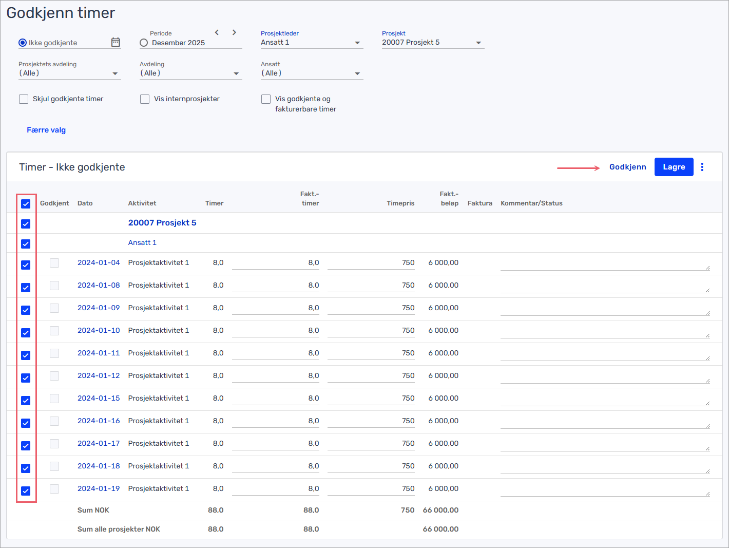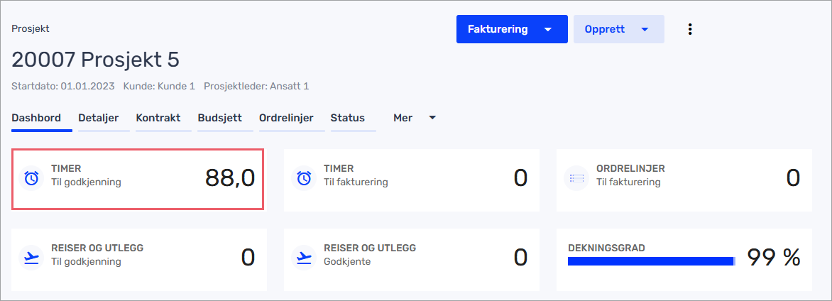 - Gå til Timeliste > Godkjenn timer eller klikk på «Timer til fakturering» på prosjektdashbordet.