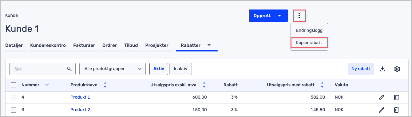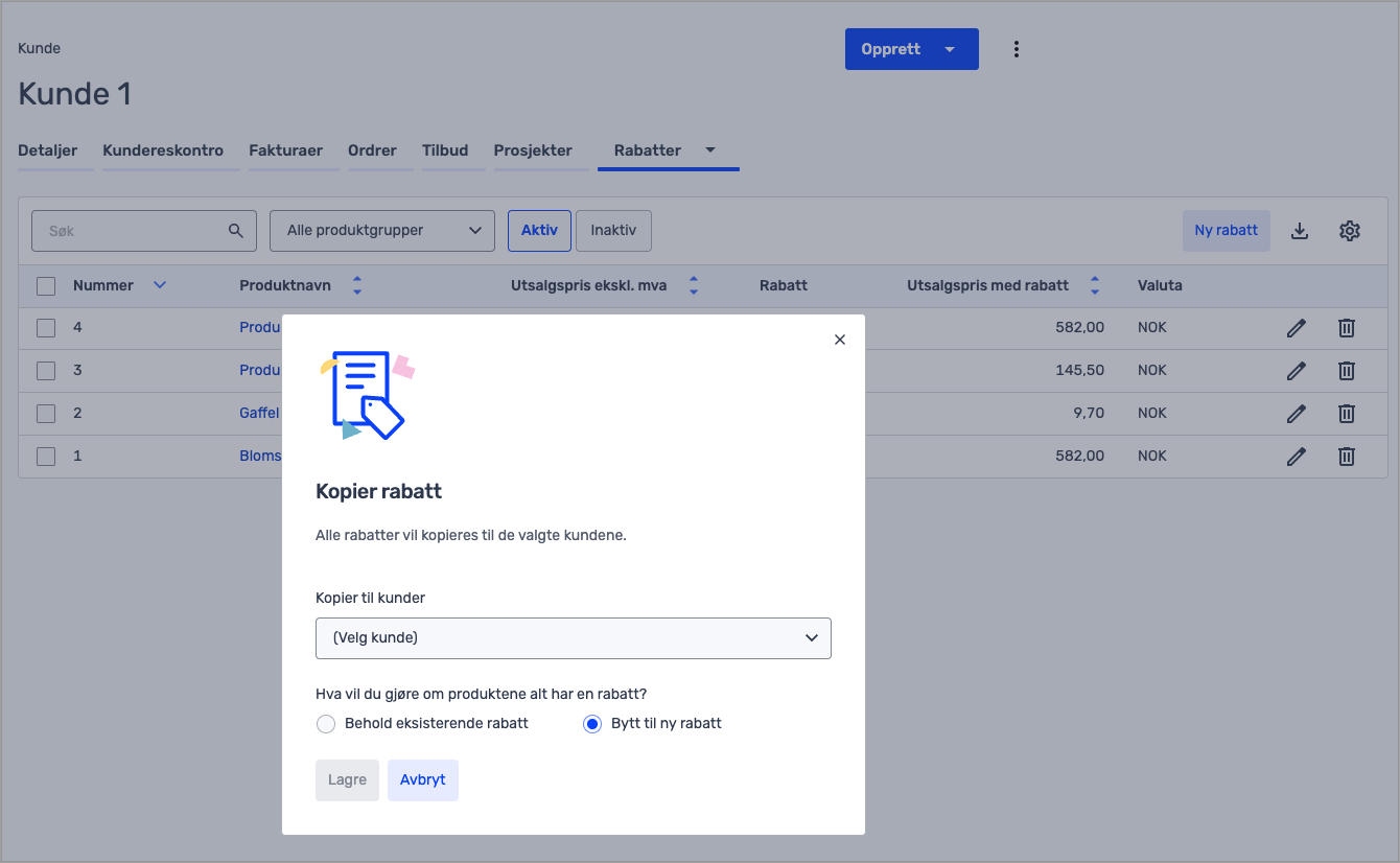 Det finnes to måter å sette opp rabatter på. Du kan enten sette opp for et spesifikt produkt for kunden eller for produkter i en produktgruppe. Trykk på det du ønsker å lese mer om nedenfor.