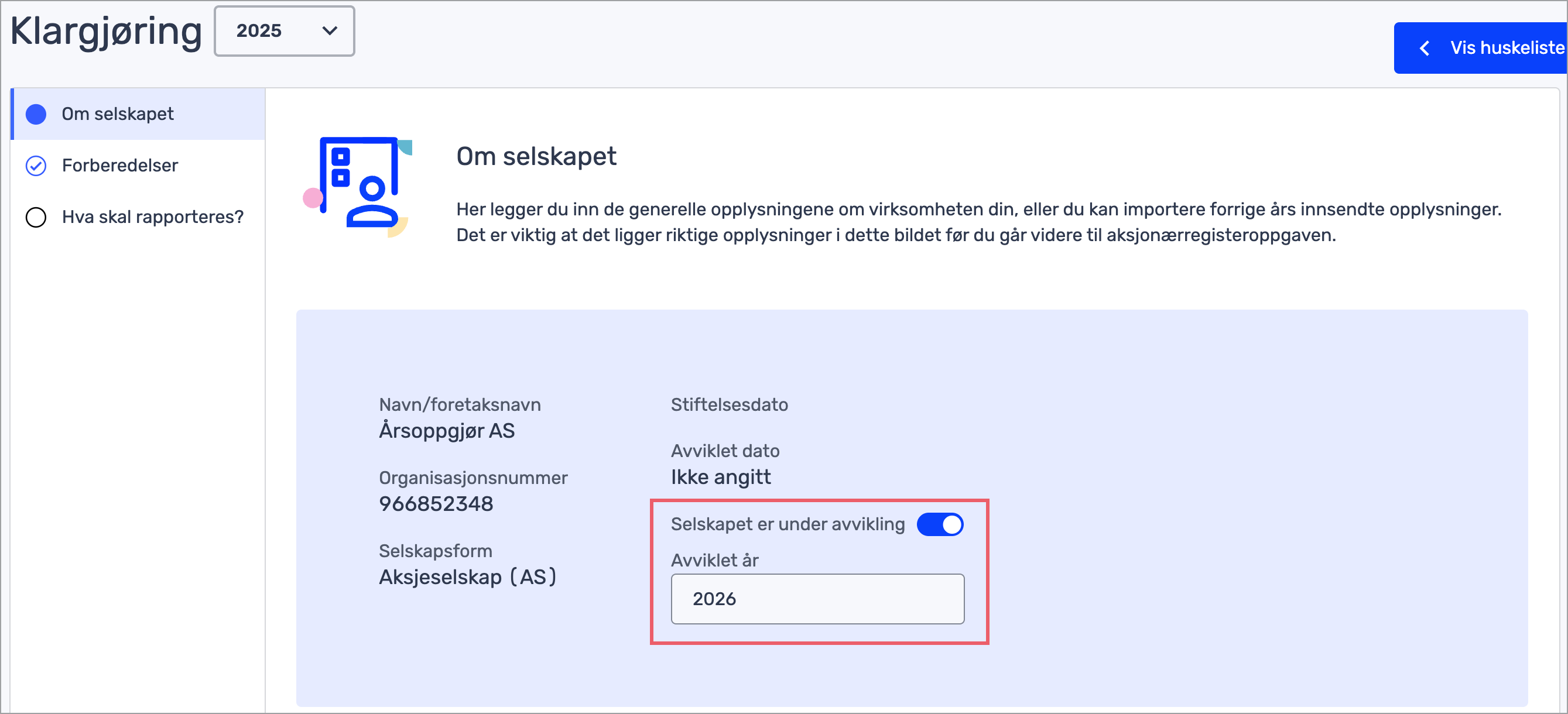 1. Gå til Årsoppgjør > Klargjøring > Om selskapet i venstremenyen.