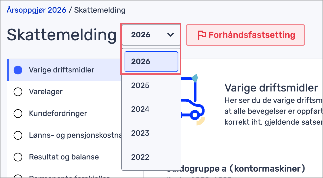 4. Øverst på siden kan du nå velge avviklingsåret. Når du velger riktig år, vil det også vises informasjon om forhåndsfastsetting.