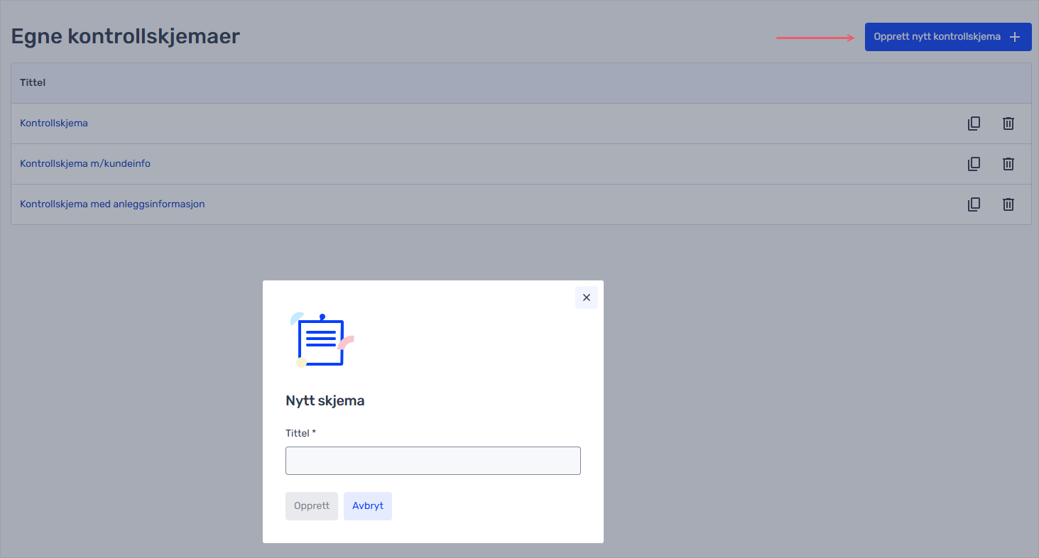 Hvis du har Komplett- eller Elektro/VVS-pakken, kan du opprette egne kontrollskjemaer i Tripletex. I denne artikkelen ser du hvordan du oppretter egne kontrollskjemaer og hvordan de brukes på prosjektene dine.
