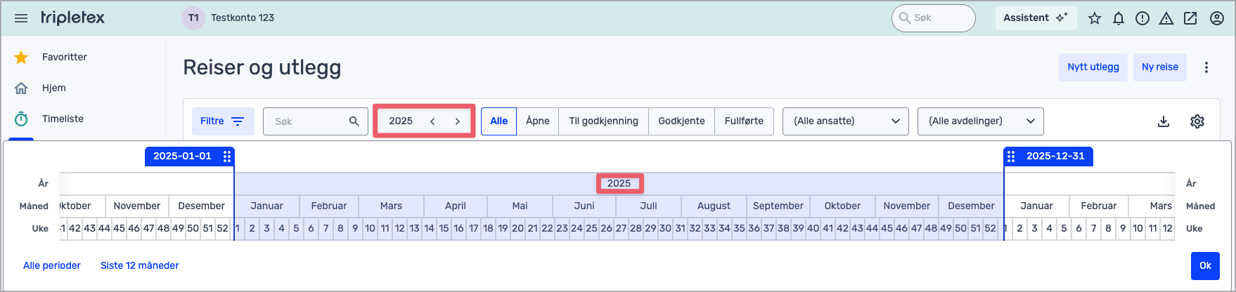 Ønsker du for eksempel å kun se reiser og utlegg for 2025, klikker du på 2025. Oversikten oppdateres automatisk, og viser kun reiser og utlegg for den valgte perioden.