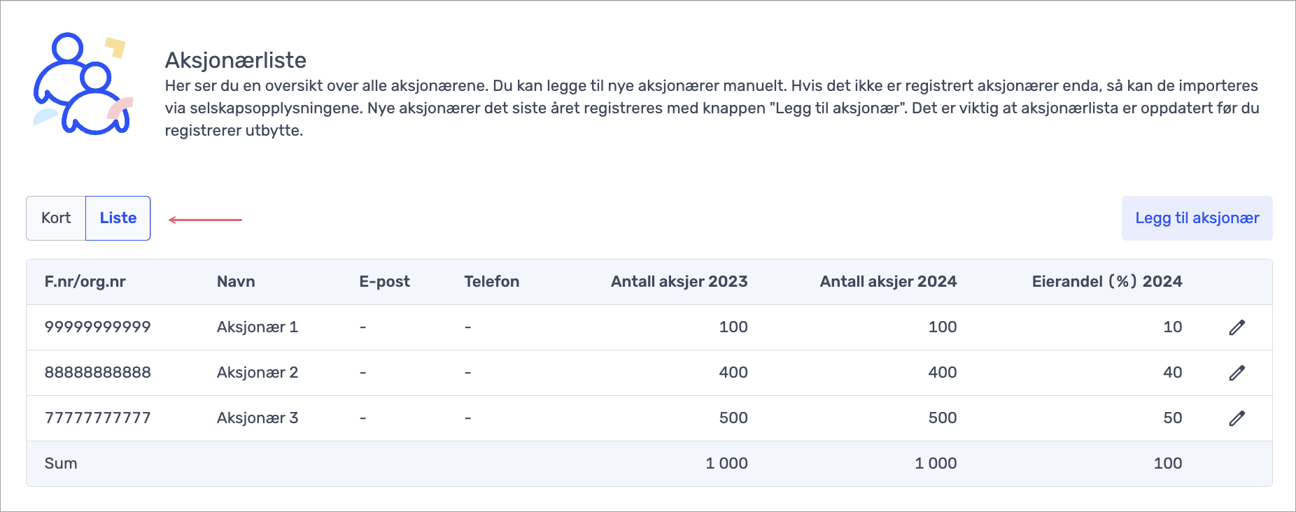 Alle aksjonærene med detaljer vises i «kortene». Trykk på «blyanten» øverst til høyre i hver rute for å se detaljert informasjon og gjøre eventuelle endringer. Endringer du gjør lagres automatisk.