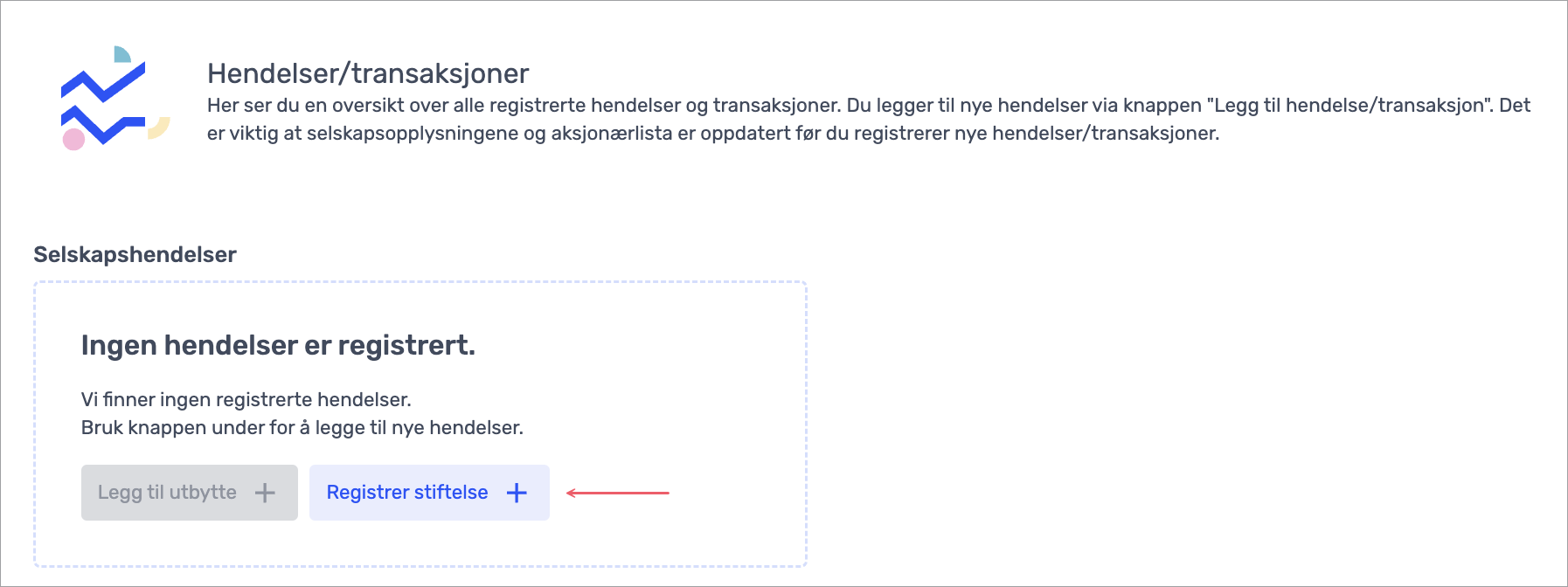 For å registrere stiftelsen som en selskapshendelse, må du først dobbeltsjekke at det ikke er lagt noe inn i steget «Selskapsopplysninger». Det må også være registrert en eller flere aksjonærer i steget «Aksjonærliste», før du kan registrere stiftelsen som en hendelse i steget «Hendelser/transaksjoner».