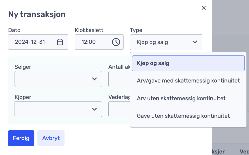 - Velg hva slags type transaksjon det gjelder.