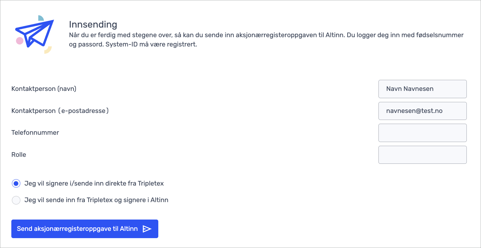 Jeg vil sende inn fra Tripletex og signere i Altinn