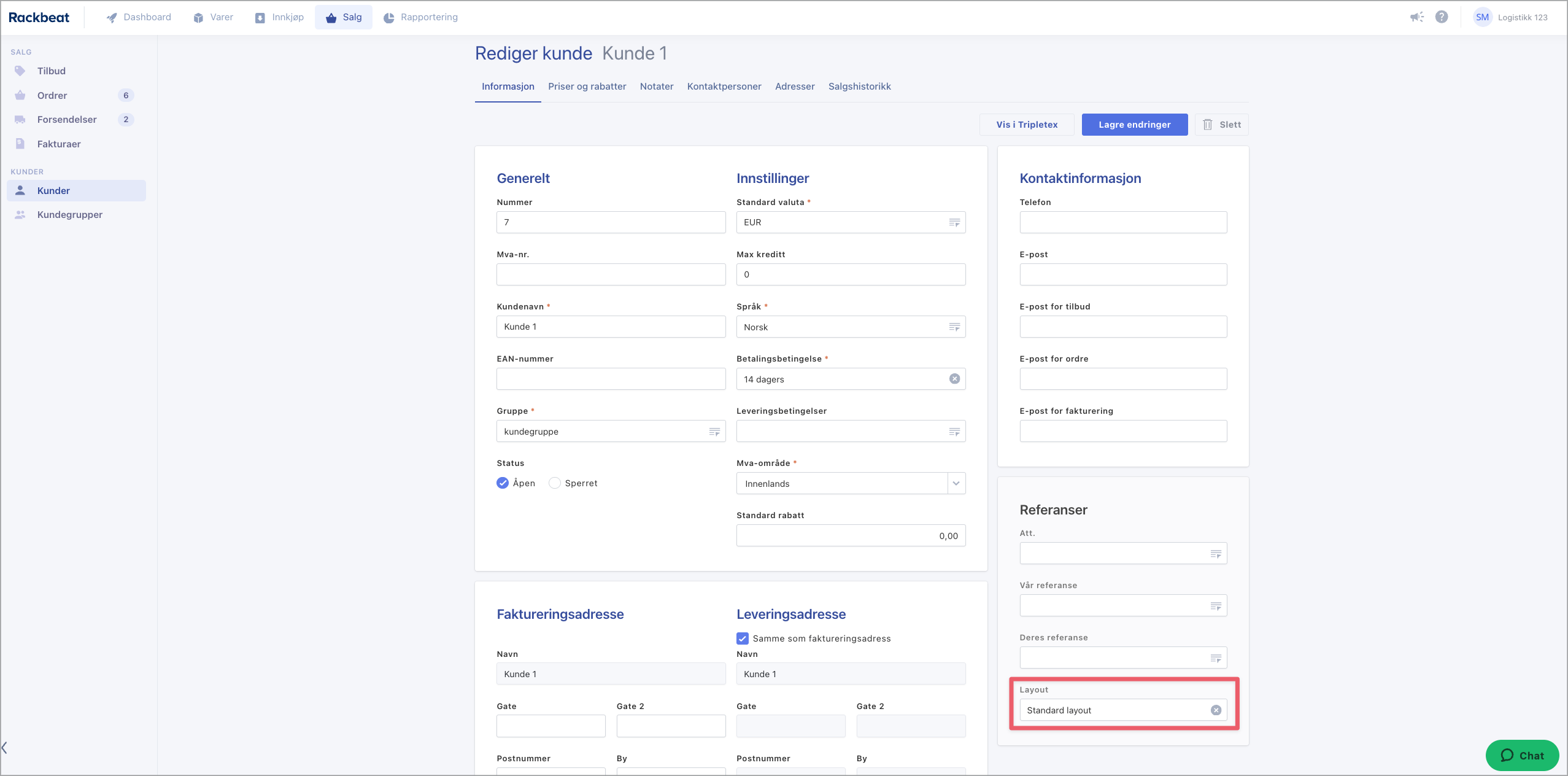 For å knytte layouten til relevante kunder eller leverandører går du inn på enten kunde- eller leverandørkortet > ser i feltet for «Referanser» og legger til layouten du vil ha. Du kan også velge en standard layout for alle nye kunder og leverandører i de generelle innstillingene dine.