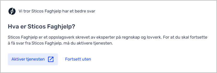 Sticos faghjelp må aktiveres både på selskapsnivå og på brukernivå. Hvis du tidligere har avslått å bruke Sticos faghjelp ved å trykke "Fortsett uten" på bildet nedenfor, kan du fortsatt aktivere tjenesten i ettertid.