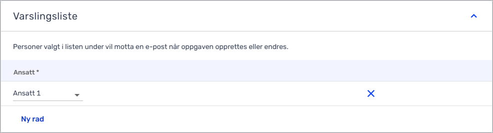 I seksjonen «Varslingsliste», setter du opp hvilke ansatte som skal få et varsel på e-post når oppgaven opprettes eller noe endres i selve oppgaven. Dette feltet er obligatorisk.