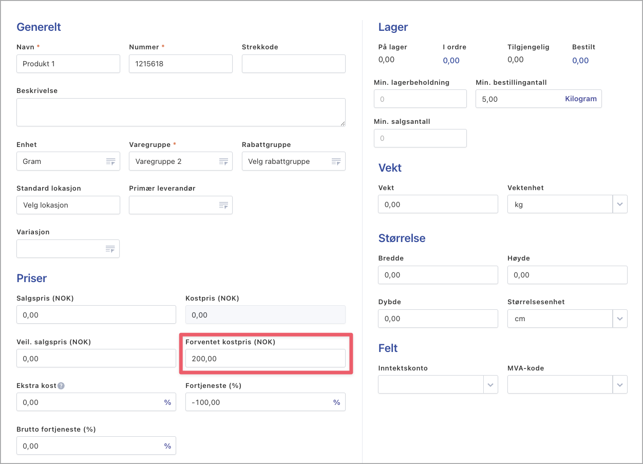 Den forventede kostprisen legger du inn på produktkortet i feltet «Forventet kostpris».
