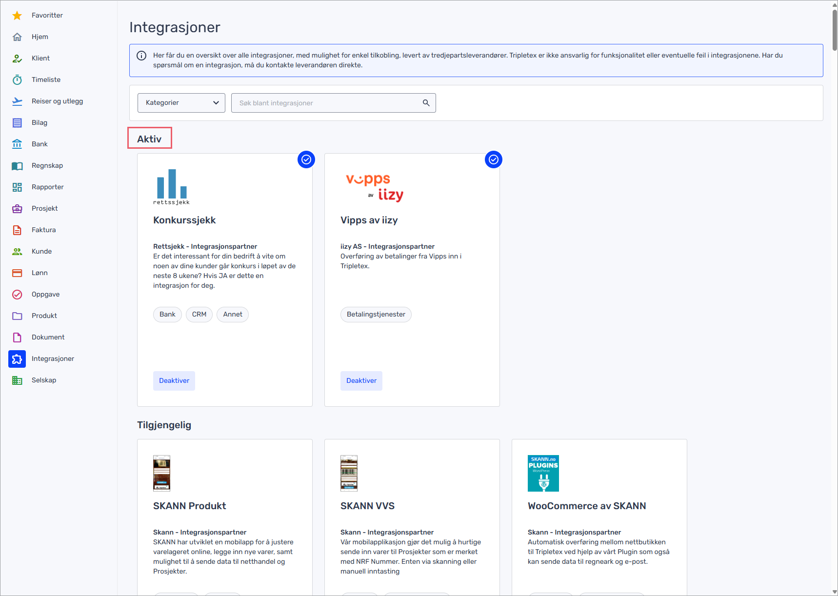 Det er to ulike måter å sette opp integrasjoner i Tripletex på. I denne artikkelen går vi gjennom hvordan du kan se hvilke integrasjoner som er aktivert i kontoen din.