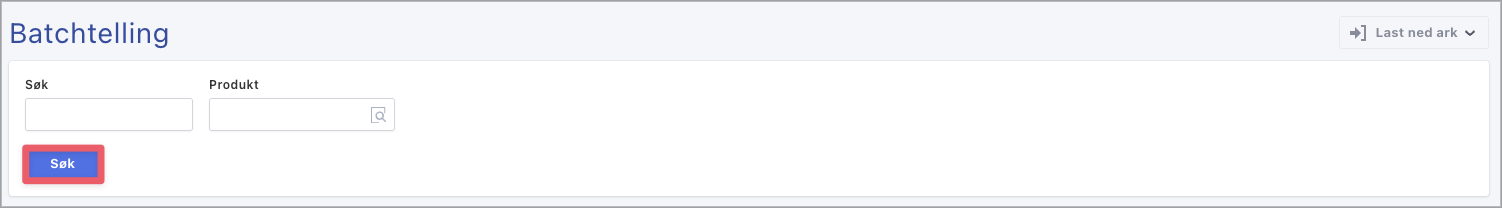 Hvis du vil se alle produkter med batchkontroll, trykker du på søk uten å legge til mer informasjon. Hvis du kun vil se ett produkt med batchkontroll, velger du produktet i feltet «Produkt». - Klikk på «Søk» for å hente ut en liste over hva du har tilgjengelig på lager med batchkontroll.
