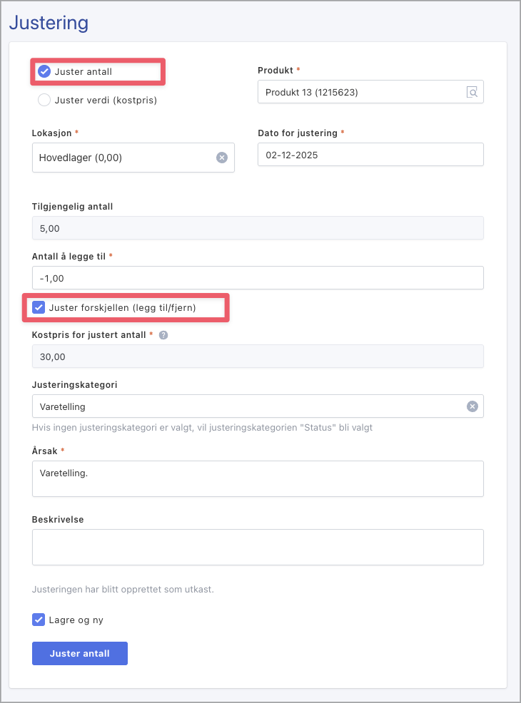 - Velg «Juster antall» og huk av for «Juster forskjellen (legg til/fjern)». Fyll inn resterende felter med informasjon. Feltene markert med stjerne er obligatorisk å fylle inn.
