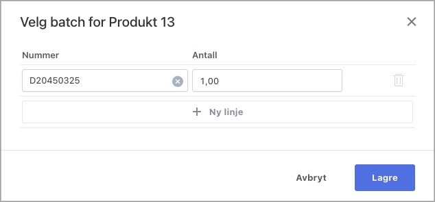 - Velg batchnummer ved utjustering av lager. Hvis du skal ta ut fra flere ulike batcher, kan du fordele radene ved å klikke på «Ny linje» og justere antallet per linje. Ved innjustering av lager legger du til korrekt batchnummer. Du kan opprette en ny batch direkte i vinduet hvor du velger batch.