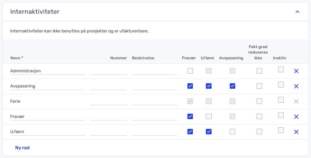 - Klikk på «Ny rad» for å opprette ny internaktivitet.