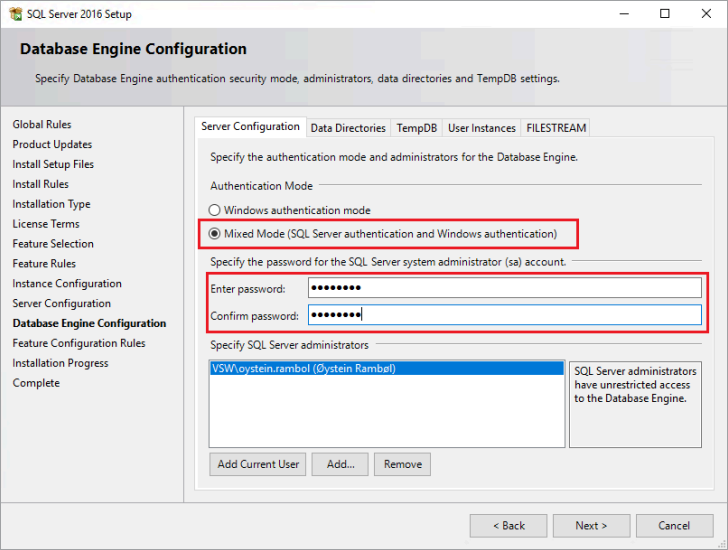 Skriv også inn et passord for SAbrukeren i SQL-serveren.