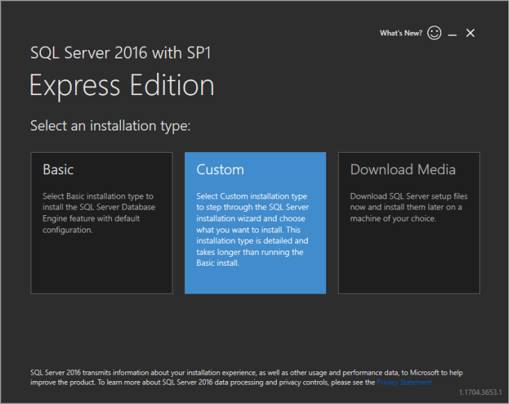 - Last ned og kjør installasjonsfilen for Microsoft SQL Server 2016 Express fra denne linken.