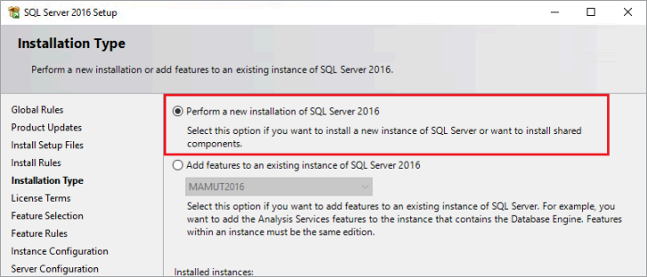 - Nå får du mulighet til å utføre en ny installasjon eller endre på en eksisterende. Velg «Perform a new installation of SQL Server 2016»: