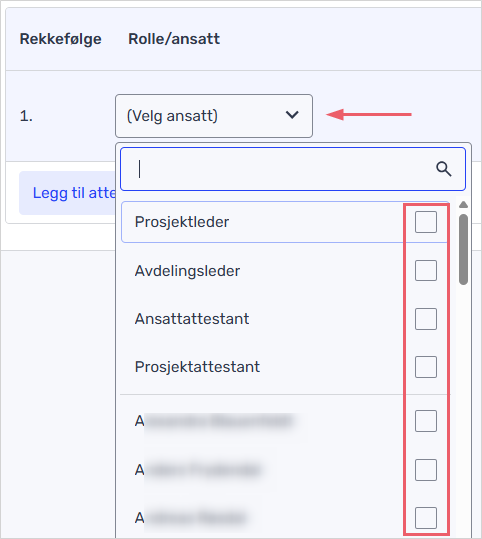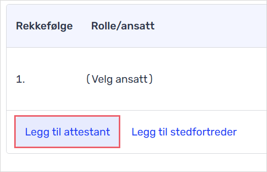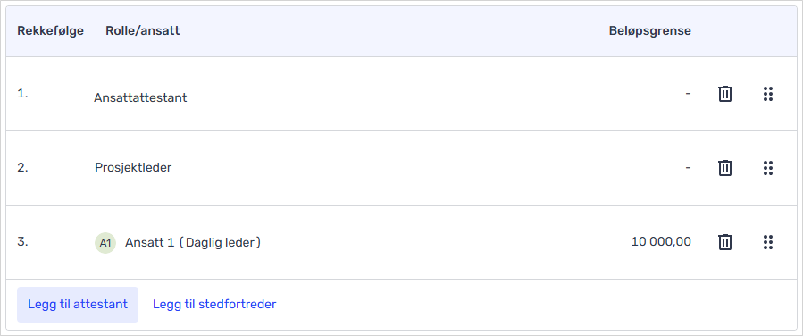 - Endre rekkefølgen på attestanter, ved å trykke og holde i prikkene til høyre for å flytte på et steg i attestantrekkefølgen.