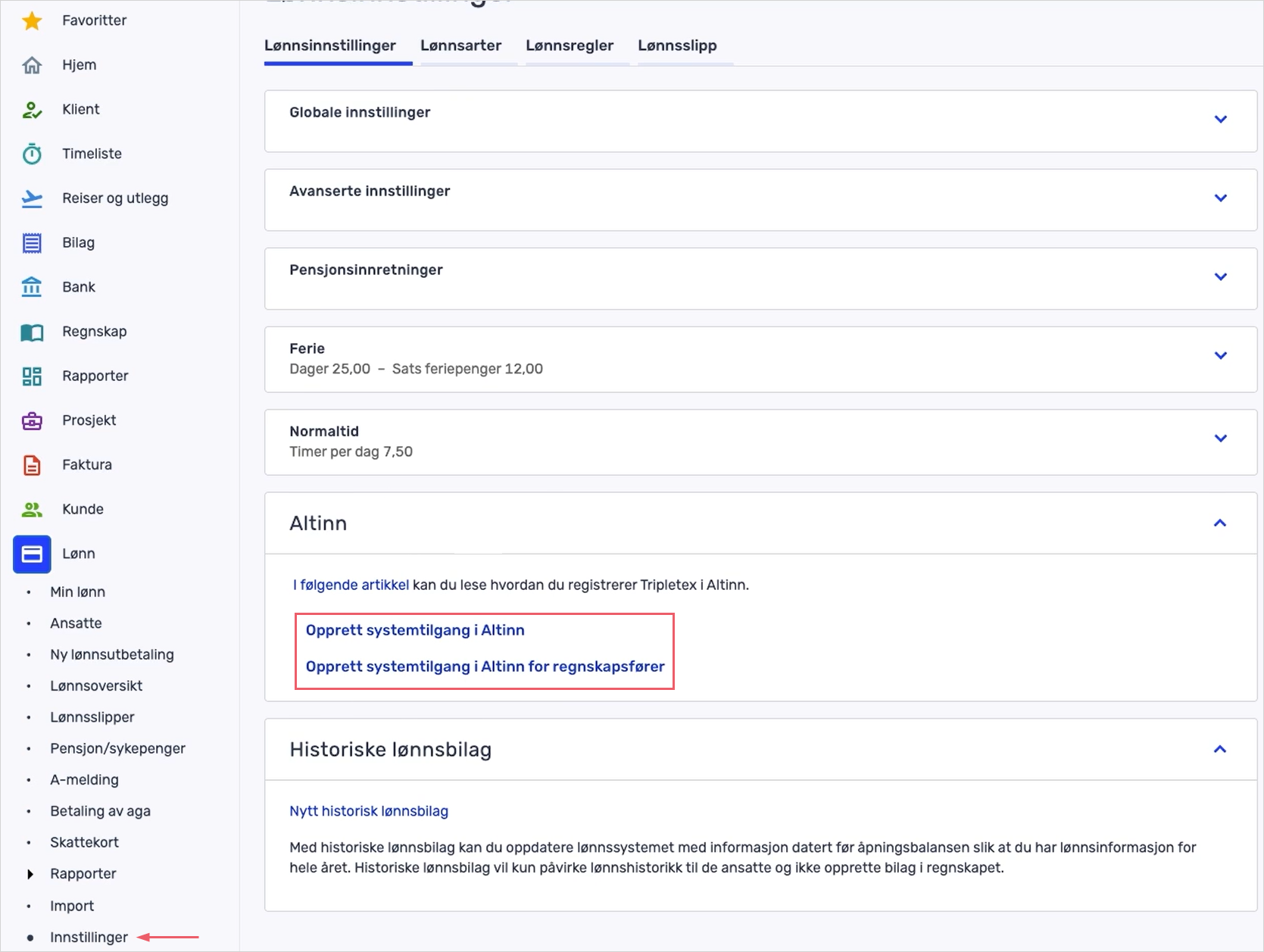 - Kontroller at systemet er koblet til under Lønn > Innstillinger. Du kan også se en oversikt over dine tilganger og klienter inne hos Altinn. Tilgang til hvem som kan sende inn styres med brukertilgangene i Tripletex og hva som er tildelt av klientene.