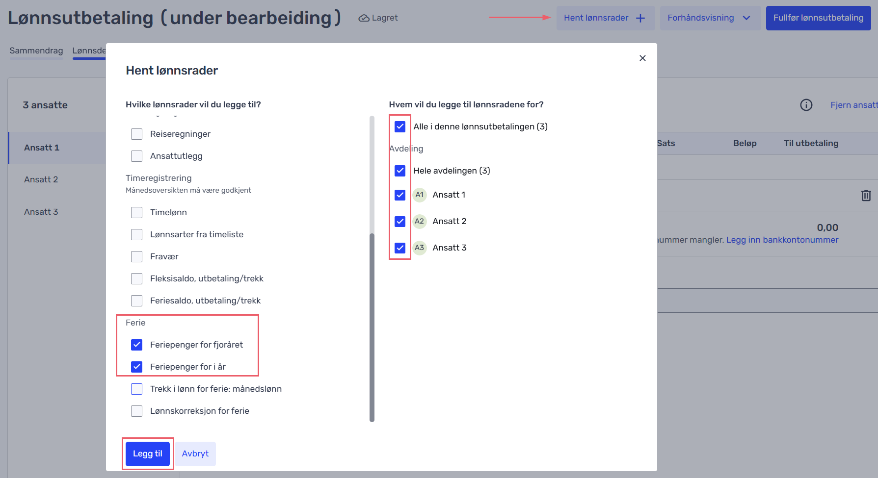 Velg de ansatte du skal hente inn lønnsradene for og klikk på «Legg til».