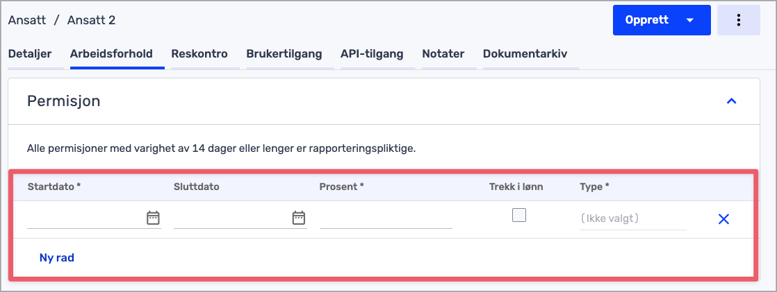 - Legg til «Ny rad». Legg til startdato på når permitteringen startet, og når den eventuelt tar slutt (hvis det er kjent), permitteringsprosent, huk av for «trekk i lønn» og velg type «Permittering».