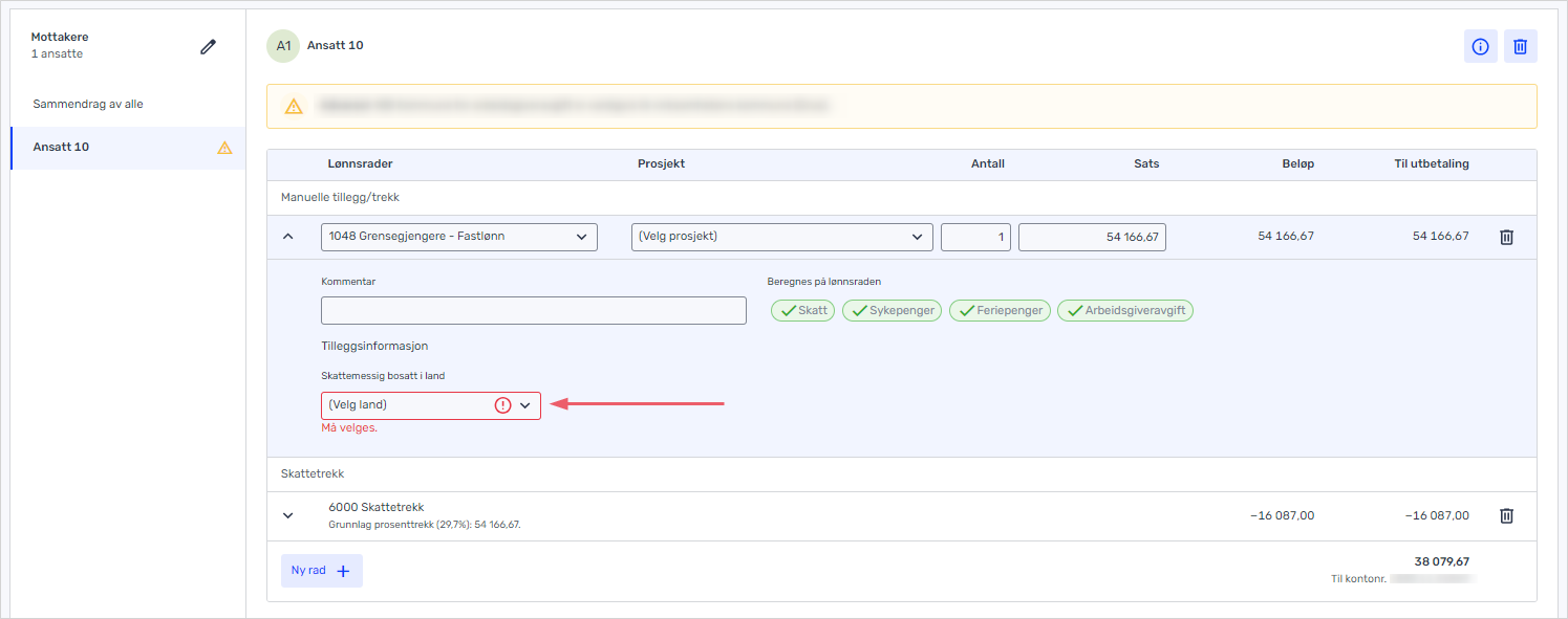 På lønnskjøringen kommer det krav om tilleggsinformasjon når du velger lønnsarten for grensegjengere. Du må legge inn landet den ansatte er skattemessig bosatt i på lønnsraden.