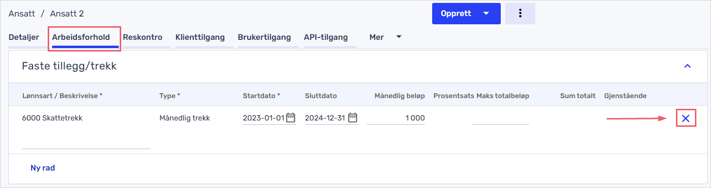 For å fjerne faste tillegg/trekk på ansatte må du fjerne det per ansatt under fanen «Arbeidsforhold» i seksjonen «Faste tillegg/trekk».
