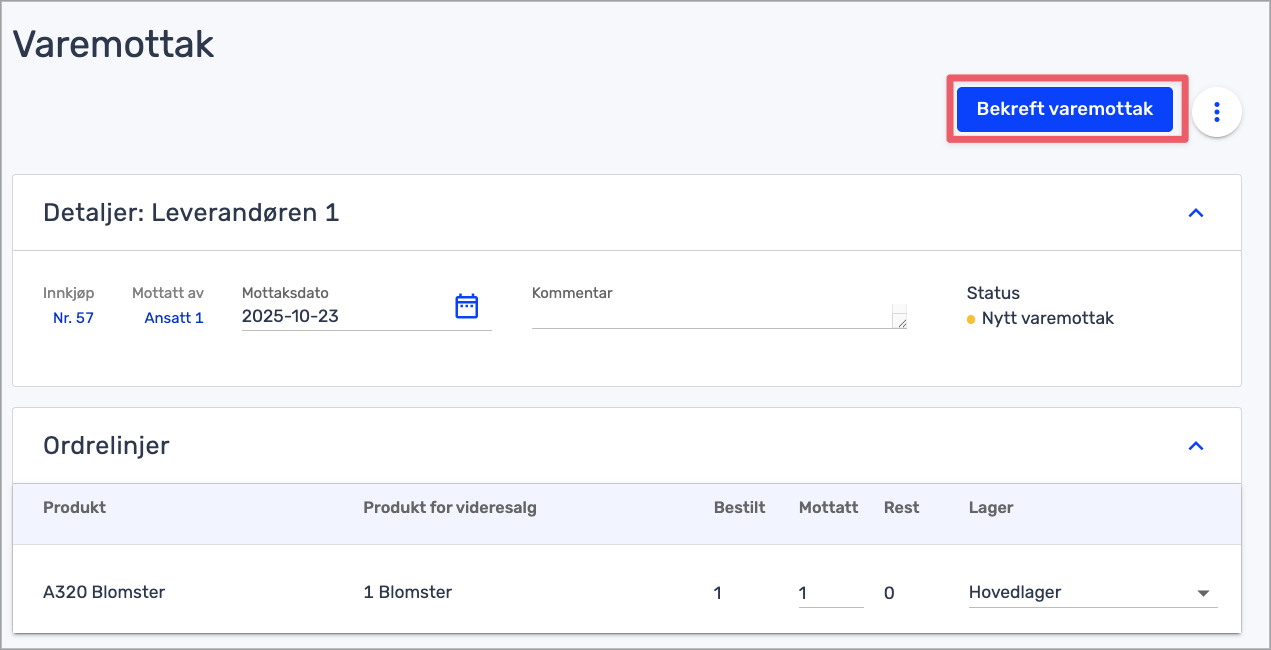 - Klikk på «Bekreft varemottak» øverst til høyre når du er ferdig. Innkjøpet markeres da som avsluttet.