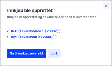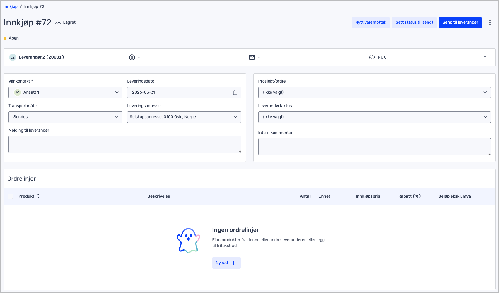 Etter at du har opprettet innkjøpet ditt, kan du velge å sende eller ta imot nytt varemottak. Du trykker på Nytt varemottak > Bekreft varemottak for å gjennomføre innkjøpet uten å sende.